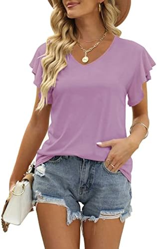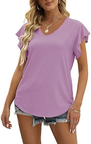 FEATURES: Basic cute summer t-shirt style, solid color, v neck, flutter short sleeves with ruffle edges, loose fit with curved hemline. The tunic top is moderate in length which makes it easy to tuck into pants or wear long over leggings. The ruffle sleeves are a nice touch to perfectly modify the shape of your arms.